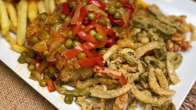 Churrasco, arroz, calamares, patatas fritas y ensalada