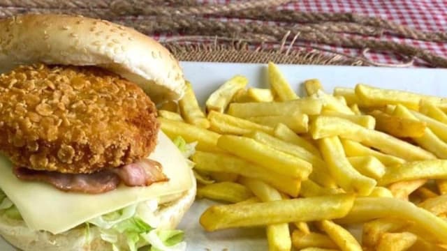 Delicia de pollo crujiente, bacon, queso, tomate, lechuga y patatas fritas.