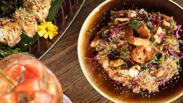 Garnaal, avocado, komkommer, wortel, kataifi en sesamdressing