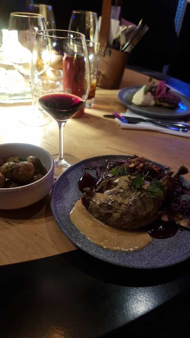 - Rostad potatis, svartvinbärsgelé, kålsallad, apelsin, granatäpple, gräddsås, valnöt, persilja
