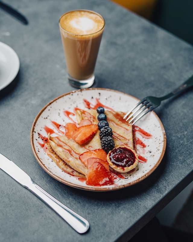 - Panquecas, molho de natas brûlée com alguns frutos vermelhos.