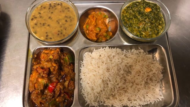 Een typisch nepalees alledaags gerecht geserveerd met linzen, seizoensgroentencurry, raita en zelfgemaakte augurk als basis.