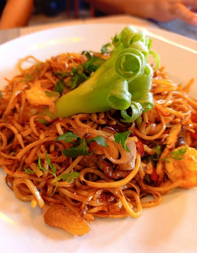 Arroz basmati com legumes, frango, cordeiro e camarão tigre, cajus, garam masala, cebola, alho, água de rosas, gengibre, piri-piri em pó, açafrão, tomates e especiarias.