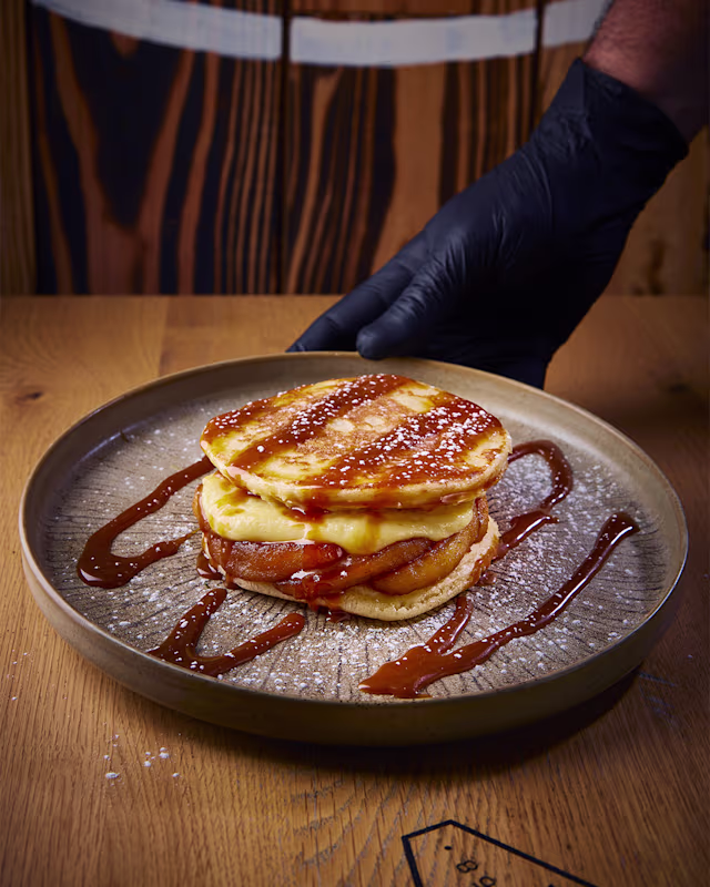 - Steak haché façon bouchère , fromage à raclette fumée, galette de pommes de terre, bacon grillé, oignons confits, sauce mayonnaise à l’ail noir, oignons crispy, bun brioché