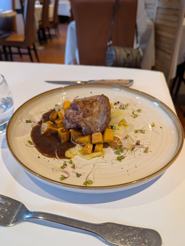 Chevreuil rôti, carottes, céleris confits et sauce aigre douce