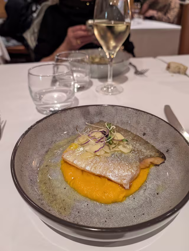 - Pavé de saumon, gastrique de kumquat et mousseline de chou-fleur