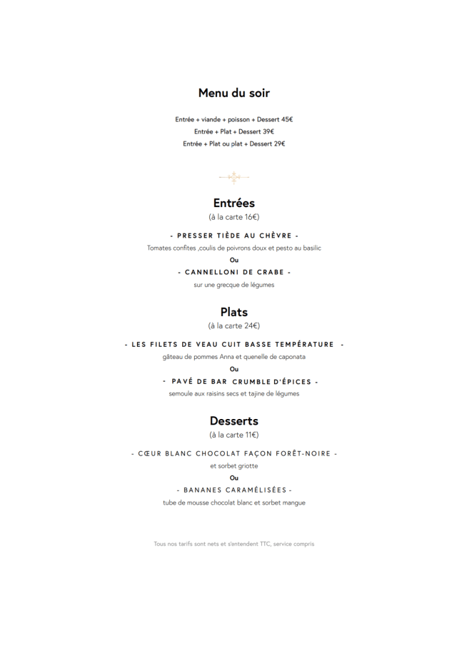 5/10What a disappointment. The food was good, but the front of house just wanted people to eat quickly and get out so they could get the next people in. This was the worst experience we had in France in the five weeks we were there. It was like being in a fast food restaurant and not a nice dining experience. Starter served within minutes, plate taken as soon as you had finished and then main put on table. Bill thrown on the table whilst still eating. I felt sorry for the chefs who you could see working hard to produce good food, but very let down by the front of house staff. Don't have the house wine, it was by far the worst we had at all restaurants. Dinner in a French restaurant should be an experience not fast food. 45 minutes from entering the restaurant to being rudely given the bill!!!