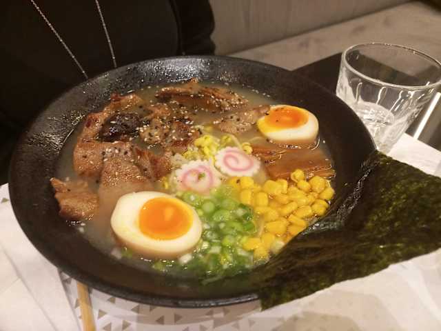 - Ramen in brodo ricco di pollo e maiale con chashu, verdure, cipollotto, bambù, alga nori e ajitama.