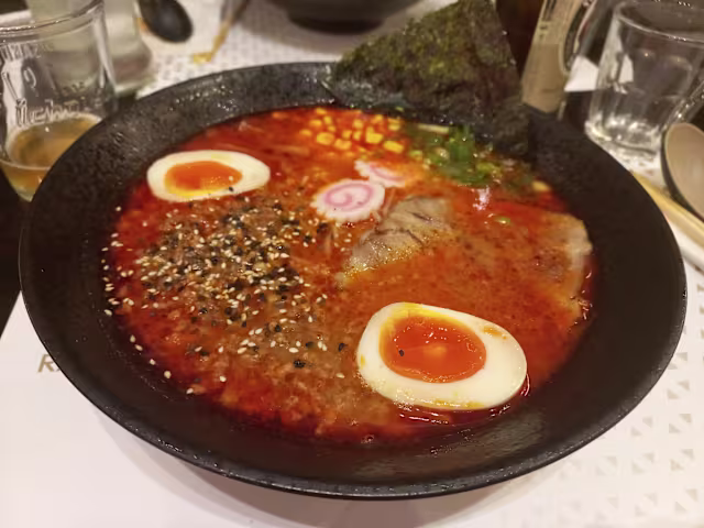 - Brodo cremoso e piccante di miso con carne macinata di maiale, verdure, bambù e ajitama
