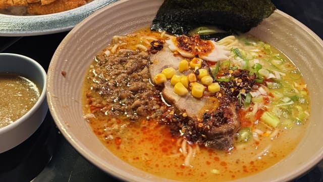 Brodo cremoso e piccante di miso con carne macinata di maiale, verdure, bambù e ajitama