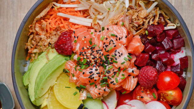 - Avocat, concombre, soja, carotte, radis, tomates cerises, betterave, oignon rouge, oignons frit, graine de sésame, ciboulette