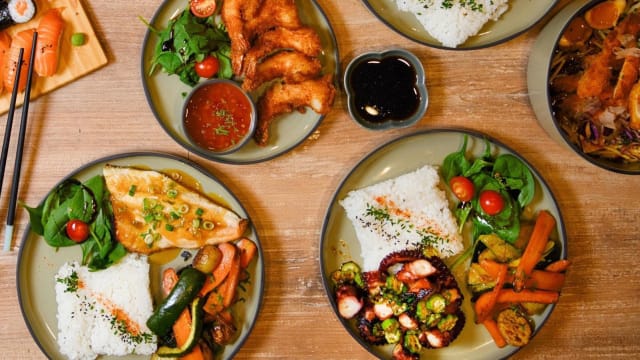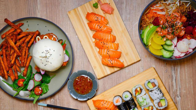 - Poulet yakitori, poulet katsu, tartare de thon, tartare de saumon, crevettes teriyaki, tofu frit