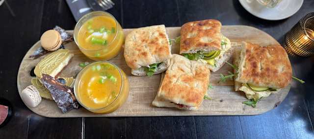 - Soepje van de dag, 2 belegde mini broodjes en een zoete afsluiter. Keuze van onze chef