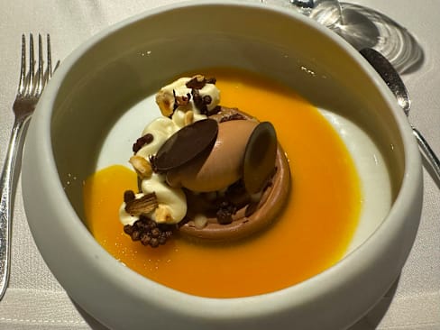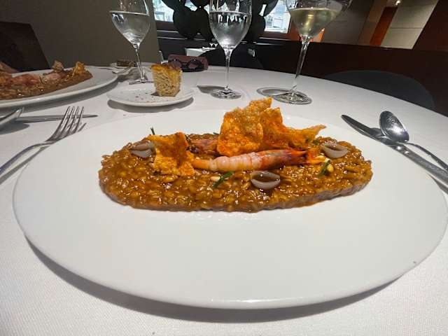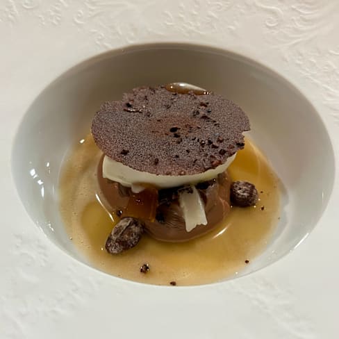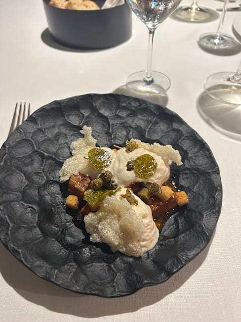 8.5/10For the primero, I had the "Cap i pota" crujiente ( Espuma de atún, alcaparras y salsa gribiche), which was quite heavy. there was pork belly in it, which was a surprise because it was not in the description. The chocolate con cerveza negra as a dessert was very good. The service was attentive and good. Nice soft music in the background but it was very noisy in the hallway.