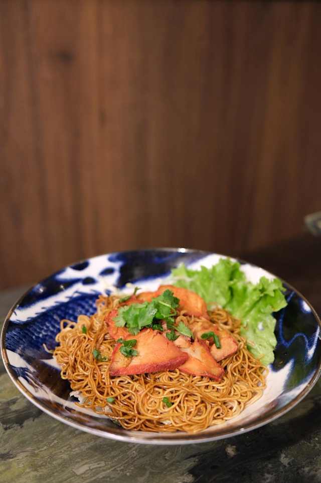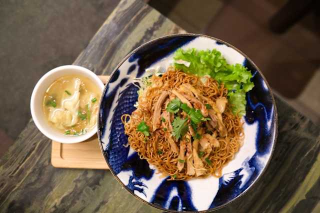 - Mi kho (porc laqué ou poulet) + son bol de bouillon avec raviolis au porc et crabe