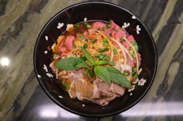 - Servis dans un bouillon épicé et parfumé, accompagnés de bœuf mariné et d'herbes fraîches
