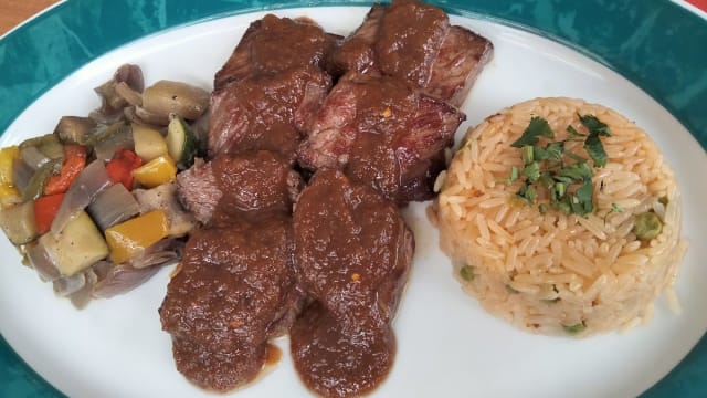 Cuarto de pollo bañado en salsa de mole, servido con arroz mexicano