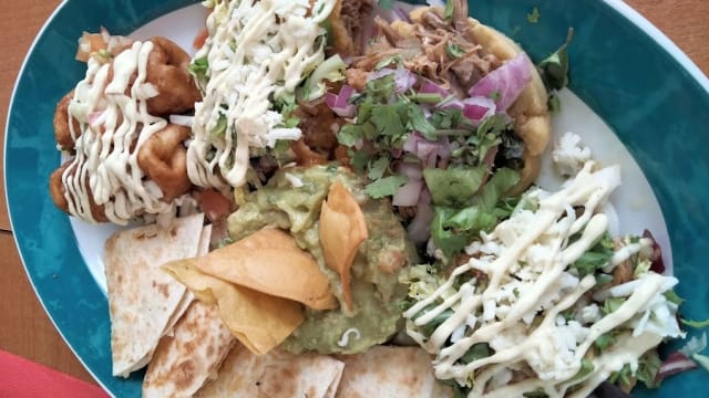 Taquitos dorados, quesadilla, chimichangas, guacamole y pelliscadas