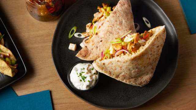 Soft tortilla with chipotle chicken, salsa, avo, lime and coriander