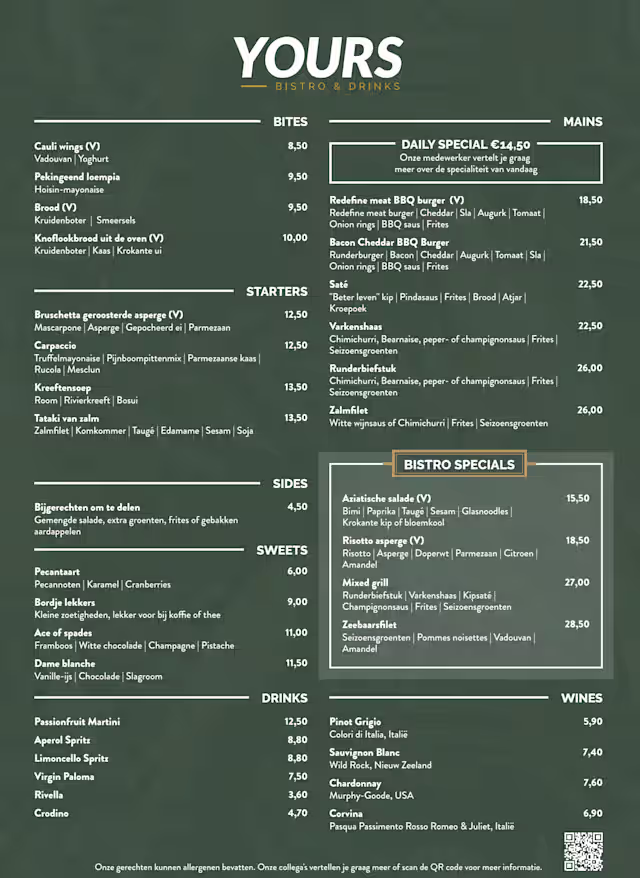 In onze gezellige ‘Yours Bistro & Drinks’ ontvangen wij je graag voor een makkelijk diner. Op de kaart vindt je de favoriete gerechten van onze gasten en een wisselende dagschotel. Wil je het echte bistrogevoel ervaren? Probeer dan een van onze Bistro ‘Signature’ items.
