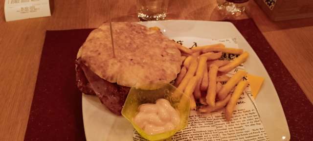 - Hamburger, melanzane, formaggio, prosciutto di praga, patè di olive, salsa rosa