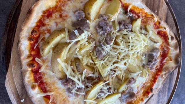 (Pomodoro, mozzarella, patate al forno, pancetta, bagoss e salsiccia)