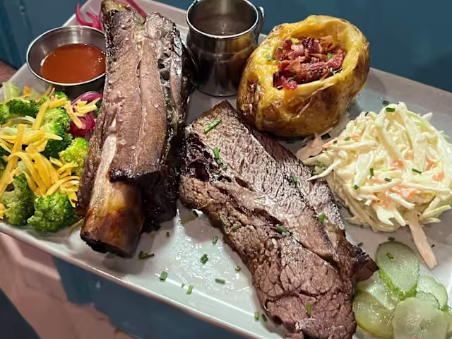 - Poitrine de bœuf angus choice provenant des états-unis, cuite à basse température pendant 14h et fumée sur place: (ta viande + 1 accompagnement au choix + 1 salade verte!)