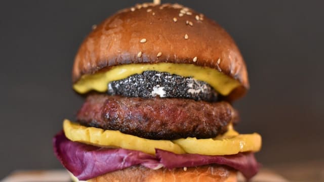 Insalata, caciocavallo piastrato, cipolla caramellata, bacon, mayo ai semi di finocchio