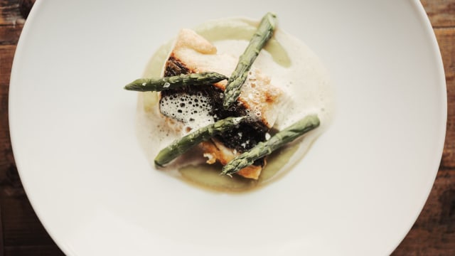 - Trancio di tonno con salsa aioli, crema al peperone piccante e cavolo nero