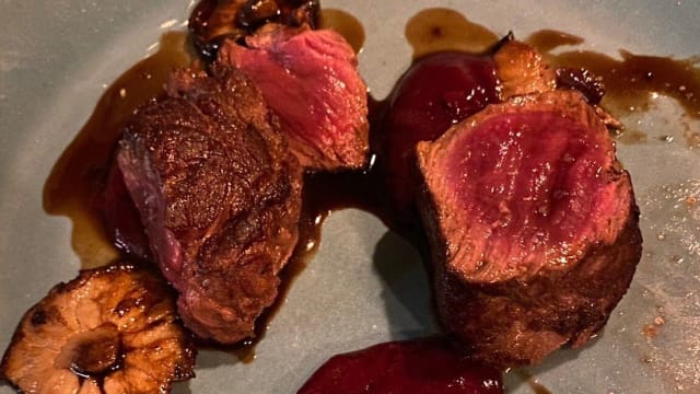 - Entrecôte di manzo con indivia alla birra, salsa ai frutti rossi e grue di cacao