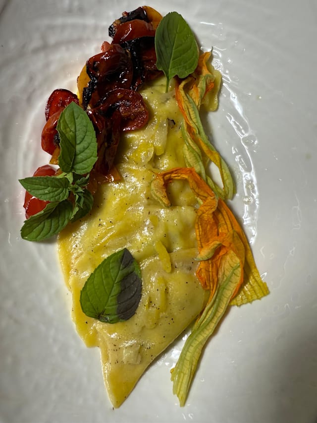 Pasta farcita di ricotta locale e zucchina trombetta alla scapece, confit di pachino e zeste di limone