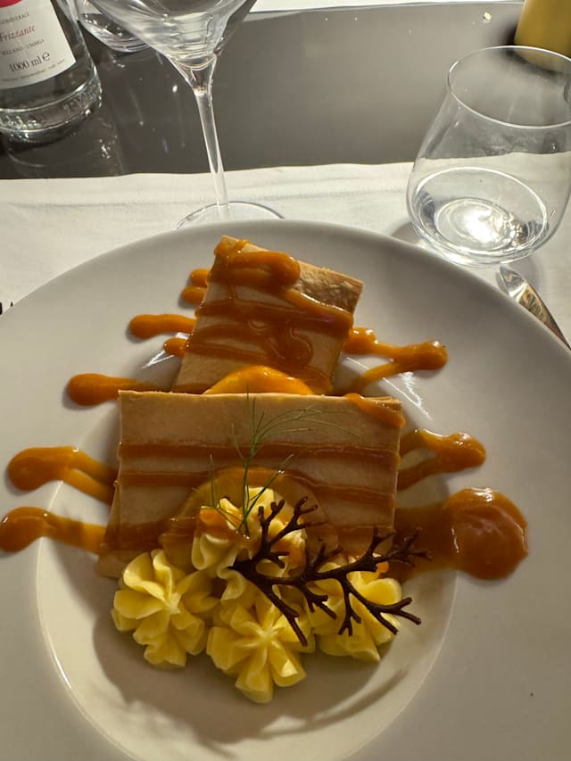 Tortelloni alla carbonara, salsa al parmigiano e guanciale croccante