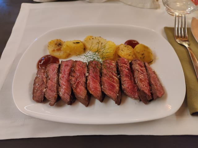 Tagliata di bovino etrusco, salsa barbecue e patate in padella