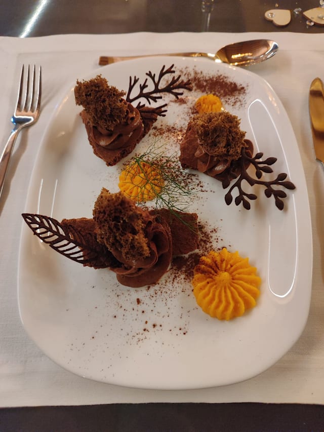 Mousse al cioccolato, frolla al cacao, spugna al caffè, gel arancia conservata
