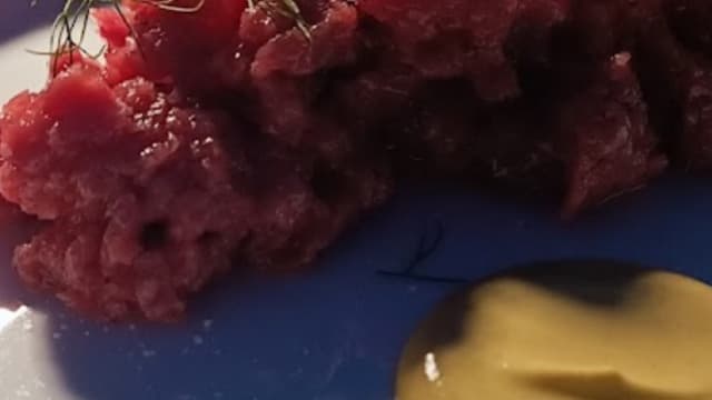 Battuta di manzo, salsa alla senape, chips di pane e giardiniera
