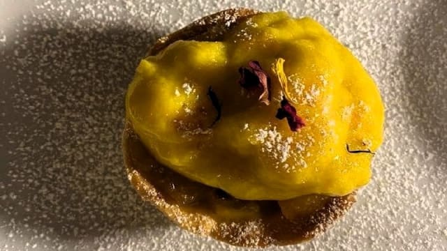 Ricotta e pere alle vinacce, noci pecan, crumble al caramello salato