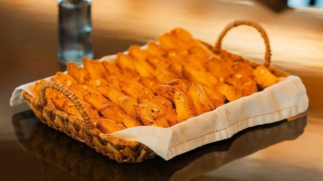 Tozzetti della casa serviti con vernaccia rossa bio di cannara