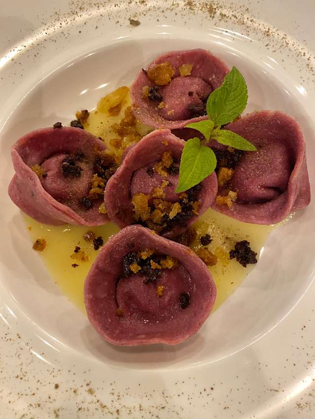 Gnocchetti di patata dolce su crema di broccoletti con anacardi e petali di rapa rossa