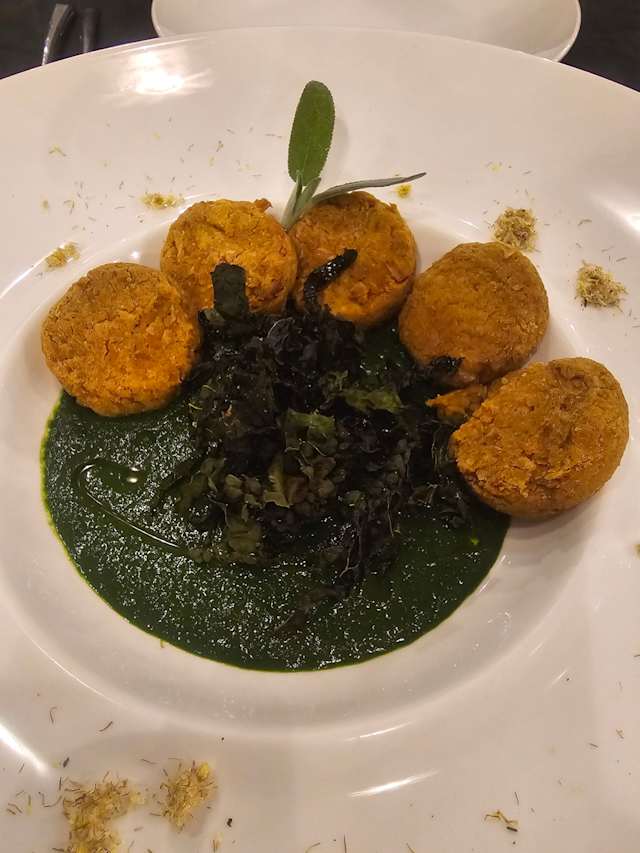Falafels di ceci speziati su crema di cavolo nero e golose chips