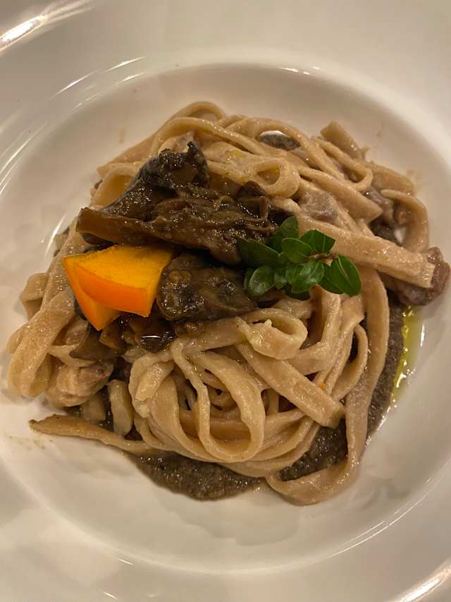 Tagliatelle al cacao con topinambur, cachi e castagne