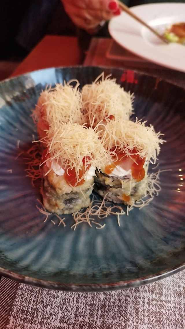 - Bao orientale dorato in tempura, tartare di salmone speziato, noccioline pralinate su mousse di philadelphia