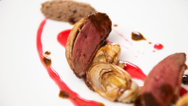 Petto d’anatra ai mirtilli con radicchio ripassato, crema di cavolo viola e coulis ai lamponi