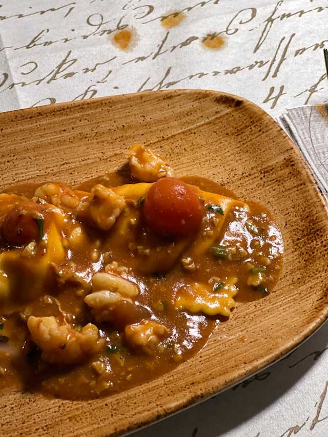 - Cappellacci(Ravioli) ripieni di capesante, con gamberi, pomodorini ciliegini e pistacchio tostato