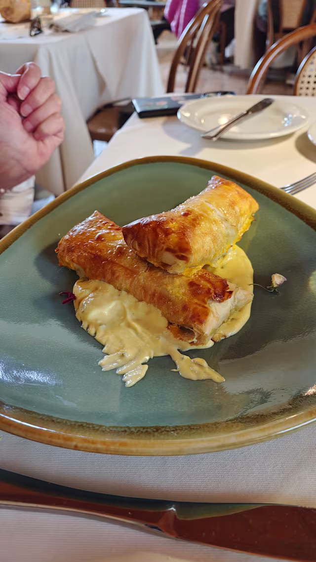 - Cannoli di pasta fillo, gamberi, julienne rapa e cappuccio, bisque di crostacei