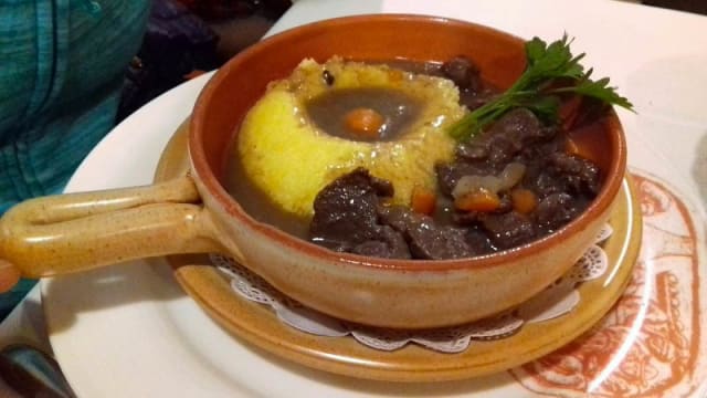 8.5/10Delicious meat on the slate, although a hot plate would have kept the meat at the right temperature for longer. Varied and affordable choice of wines by the glass. Both inside and out, the wood carvings impressed our 7-year-old son, who bombarded us with questions about them. As in many restaurants, the staff seem tired and devitalized. Times are tough and it shows. The smiles at the end of the meal did us a world of good and we'd happily recommend this restaurant.