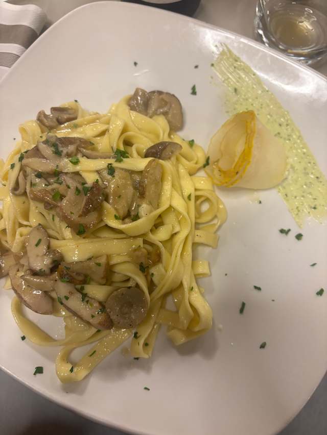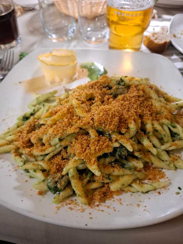 - Pasta fresca con funghi porcini dell'etna, spinaci, salsiccia e mollica tostata