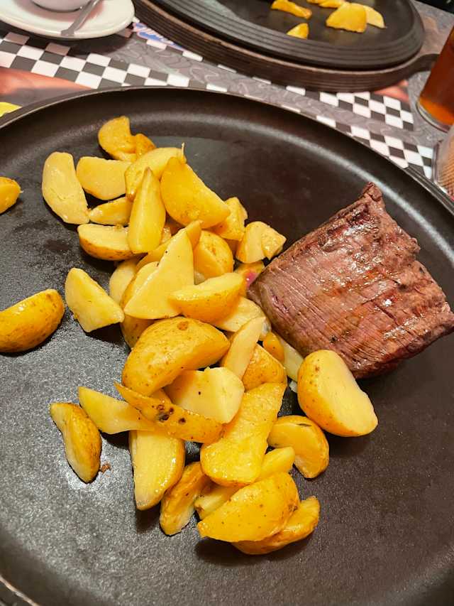 - Hamburger di manzo tedesco da 250 g servita a scelta con insalata o patatine