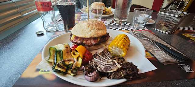 Hamburger*200gr con composto di verdure miste, patate e formaggio cheddar con insalata, pomodoro e patatine