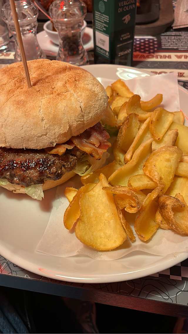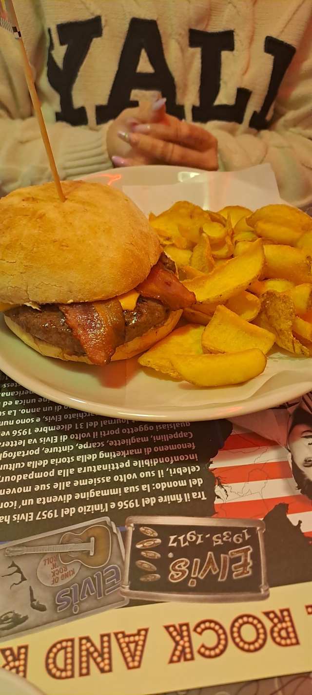 - Hamburger di manzo*220gr (italia), formaggio cheddar, bacon, insalata, pomodoro e patatine