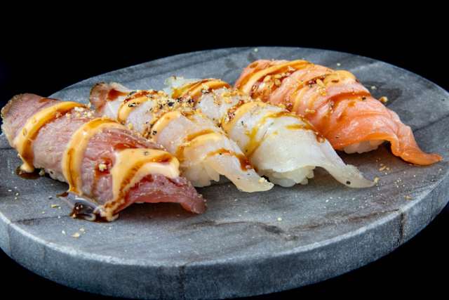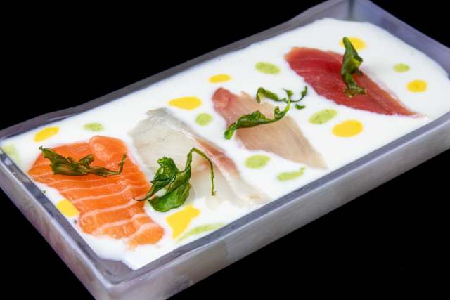 - Carpaccio di salmone, tonno, branzino, gambero rosso e scampi con salsa ponzu